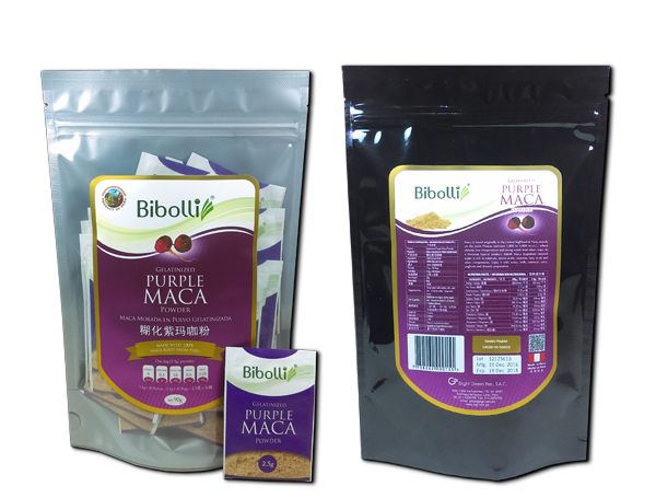 Sachet de Maca en polvo Morada Gelatinizada de 2.5 gr x 48 Unidades en caja.