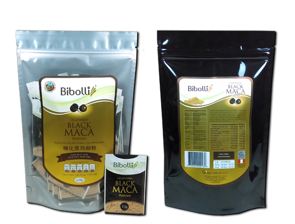 Sachet de Maca en polvo Negra Gelatinizada de 2.5 gr x 48 Unidades en caja.