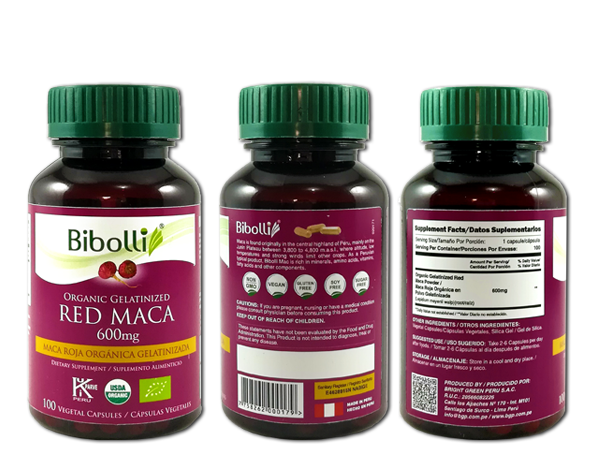 Capsulas de Maca en polvo Roja Gelatinizada de 600mg x 100 Unidades.