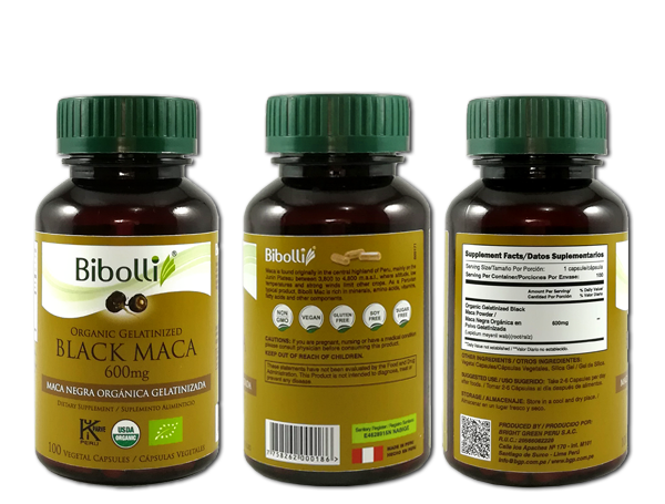 Capsulas de Maca en polvo Negra Gelatinizada de 600mg x 100 Unidades.